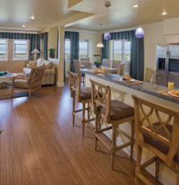 The 1100 square foot two bedroom condos sleep 6 people comfortably in a king bed in the master bedroom, 2 twin beds in the second bedroom, and queen-sized Murphy bed in the living area.